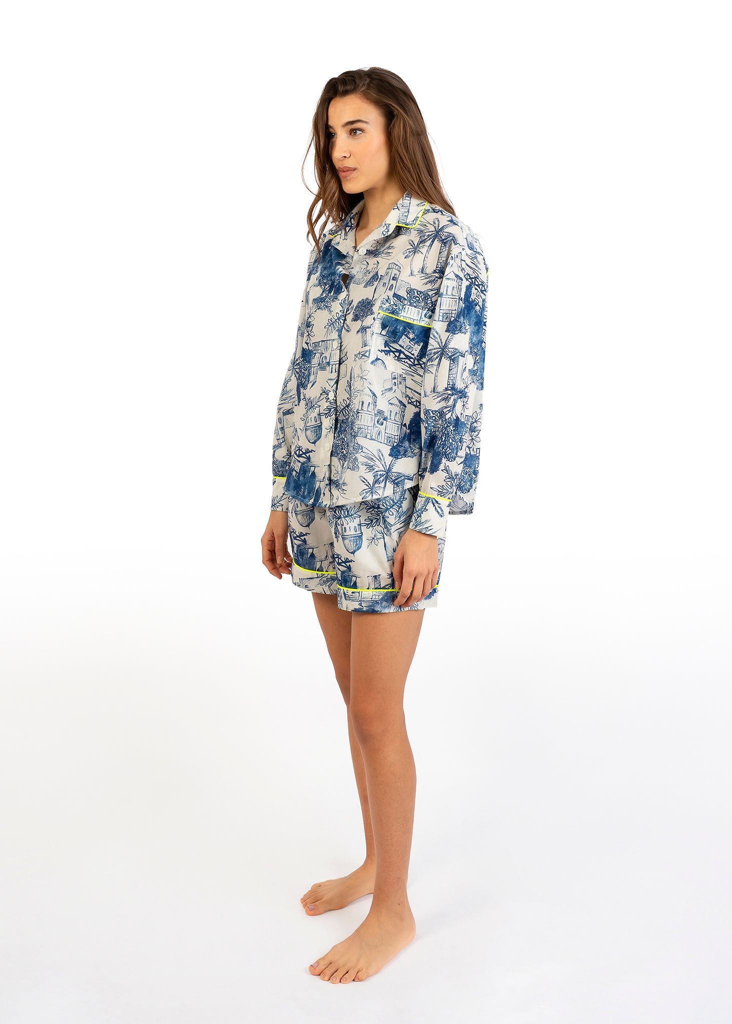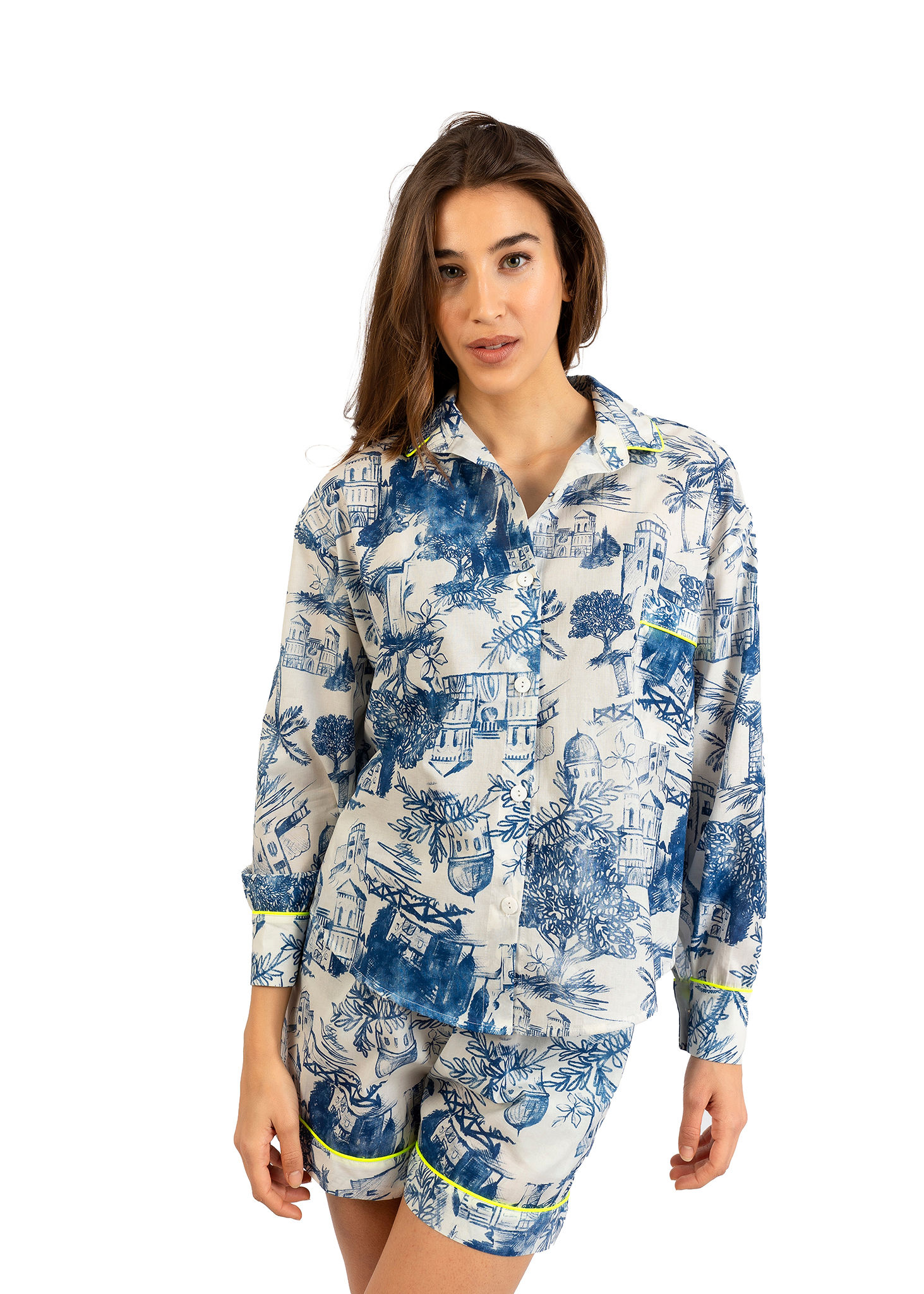 Pigiama donna Nabali in cotone con fantasia blu, camicia over e shorts, leggero ed elegante Made in Italy