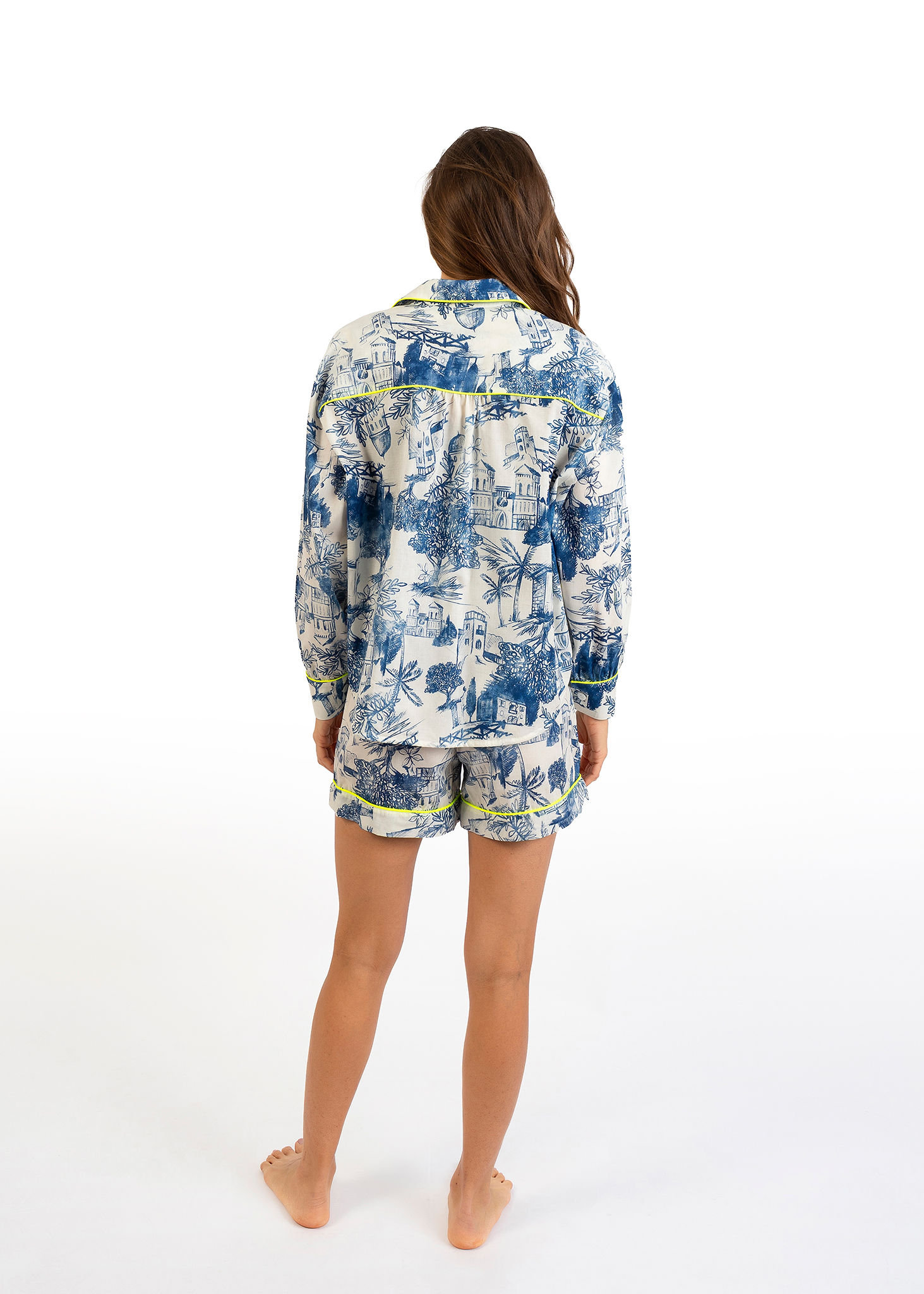 La camicia a maniche lunghe con bottoni e piping a contrasto dona un’eleganza senza sforzo, mentre gli shorts coordinati completano il look con un equilibrio perfetto tra comfort e femminilità. Un pigiama che si indossa come un piccolo lusso quotidiano.