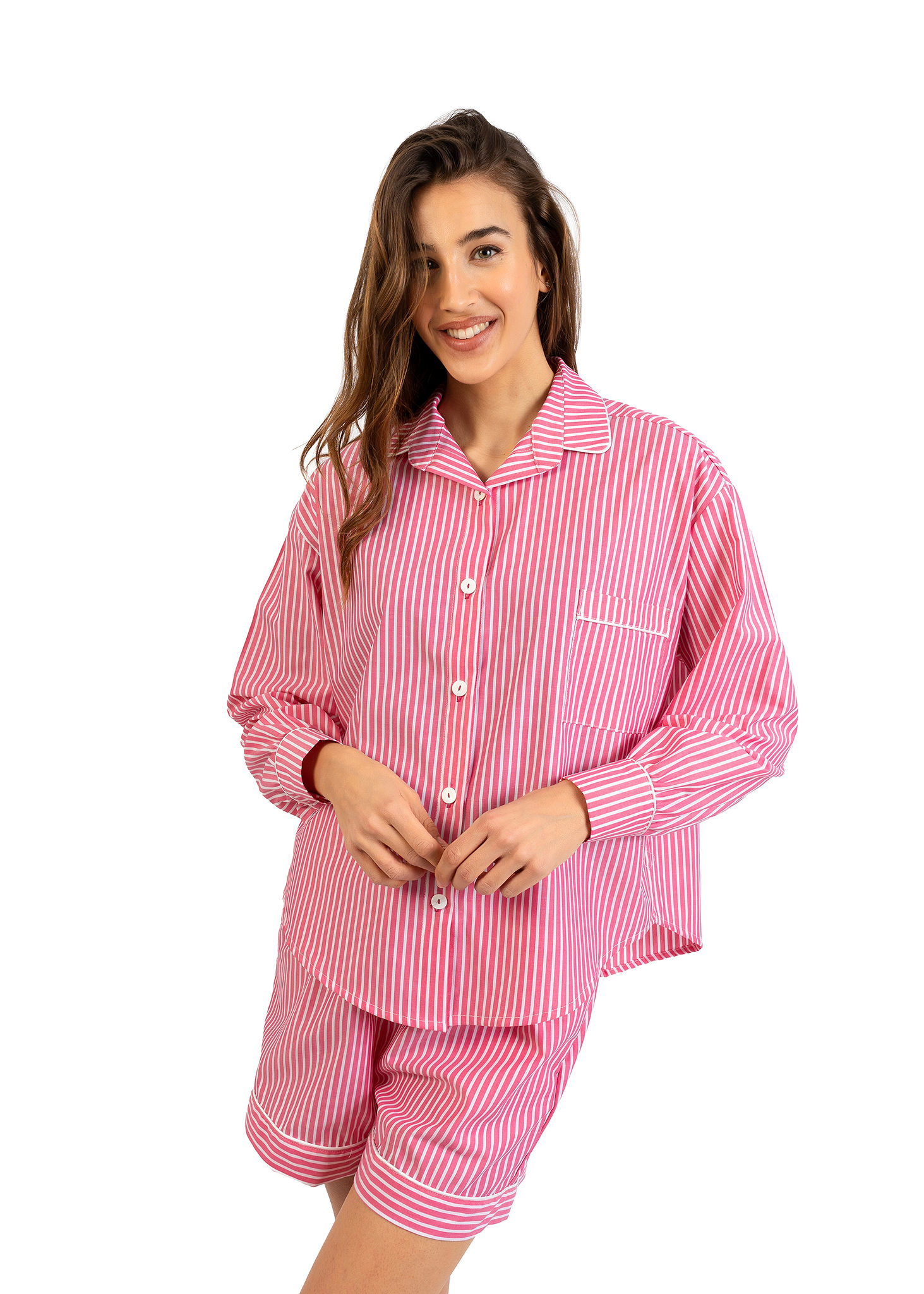 Pigiama donna Nabali in cotone a righe rosa e bianco con camicia over e shorts, leggero e fresco per estate Made in Italy