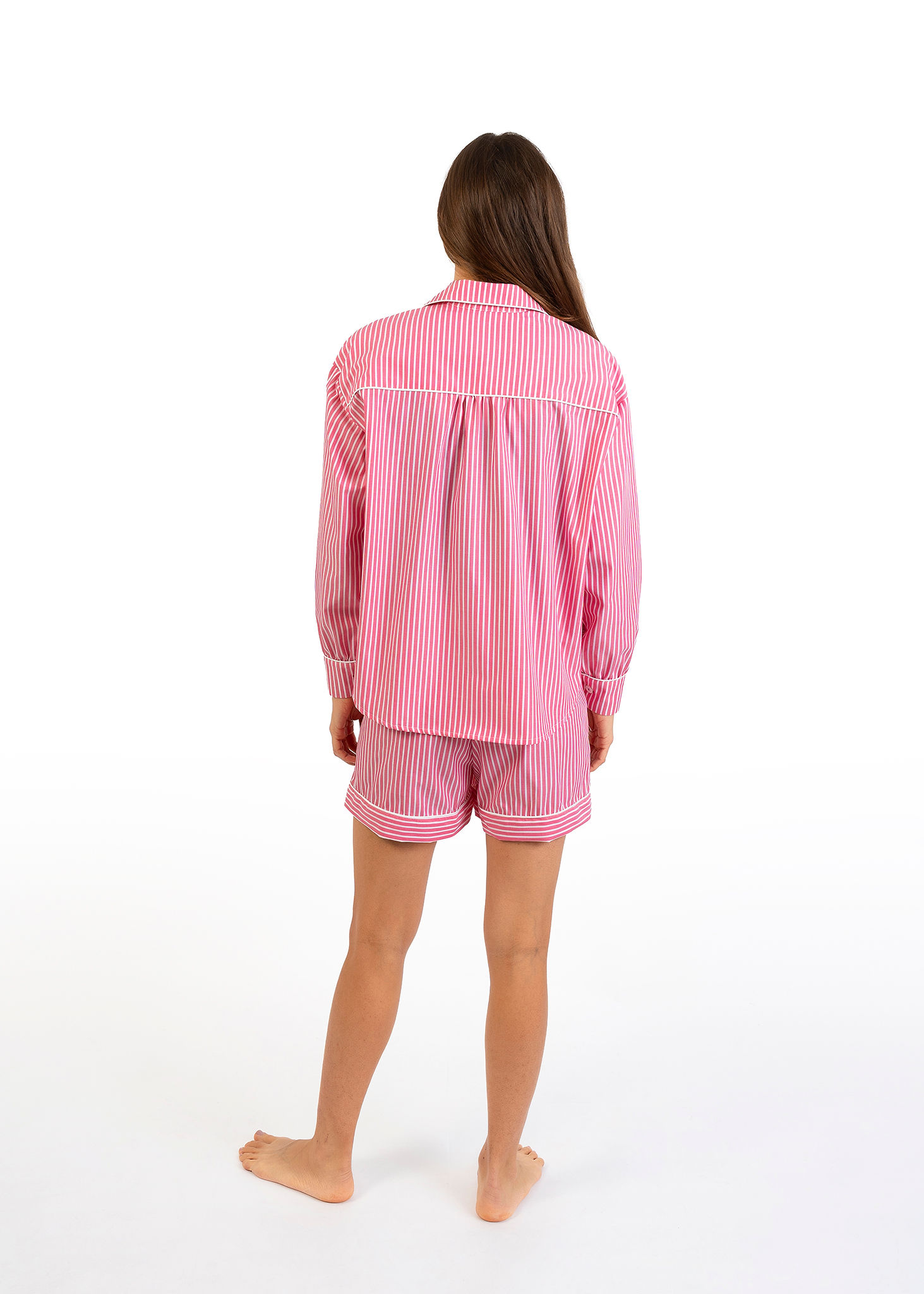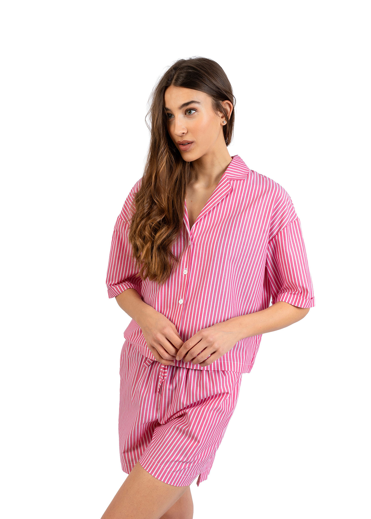La camicia con colletto e bottoni dona un tocco sartoriale, mentre i pantaloncini con vestibilità morbida garantiscono libertà di movimento e massimo comfort. Le righe rosa, luminose e delicate, regalano un immagine fresca e contemporanea.
