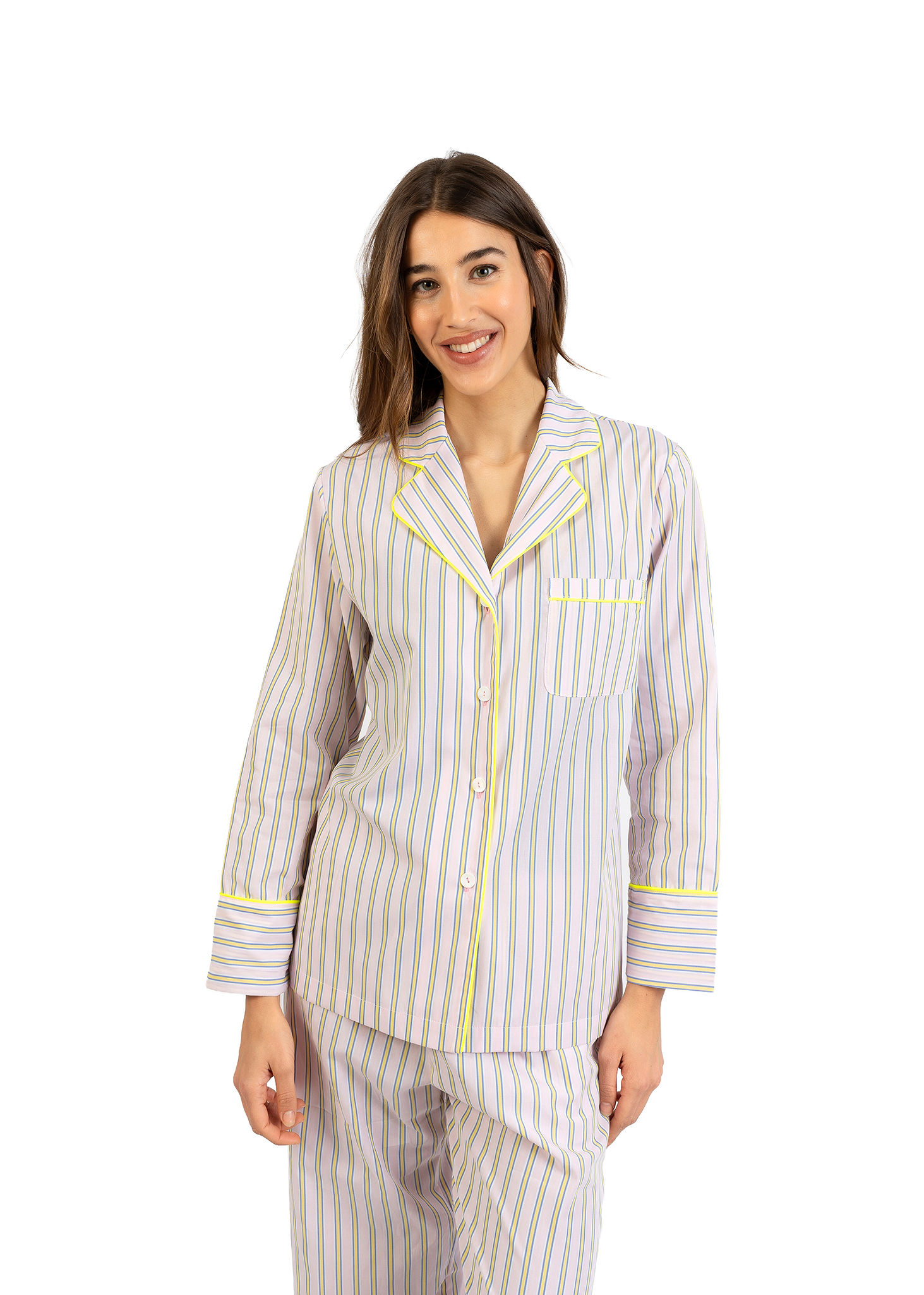 Vivace e originale, il pigiama  Nabali in cotone a righe gialle e rosa si distingue per il suo mix di colori raffinati.