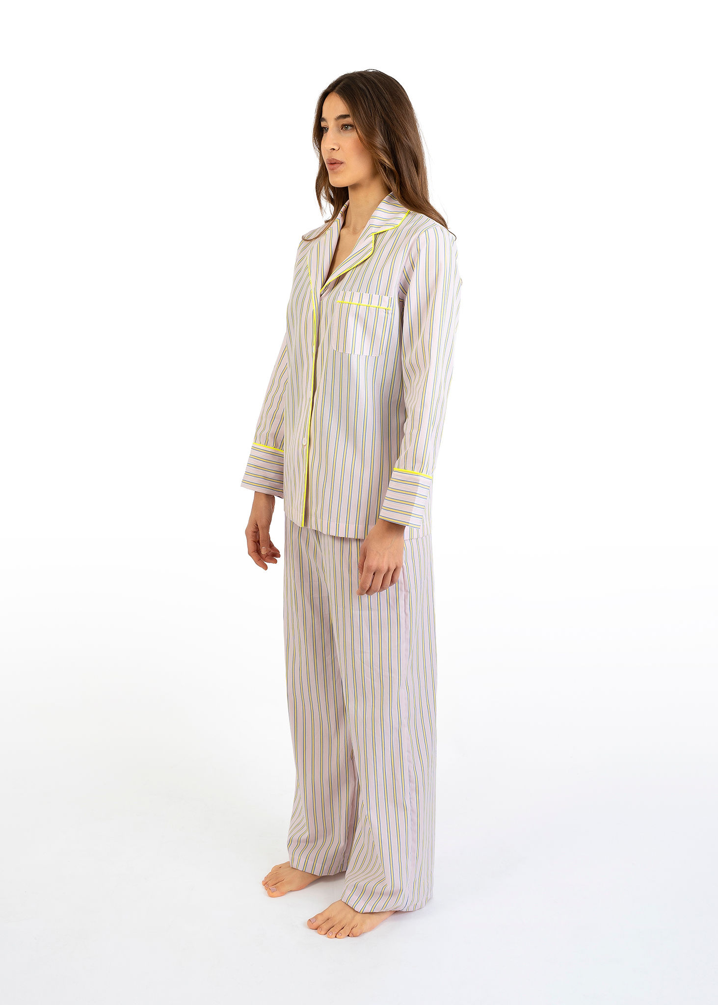 Vivace e originale, il pigiama  Nabali in cotone a righe gialle e rosa si distingue per il suo mix di colori raffinati. Le righe particolari creano un effetto dinamico e moderno, perfetto per chi desidera un tocco di personalità anche nell’abbigliamento notte.